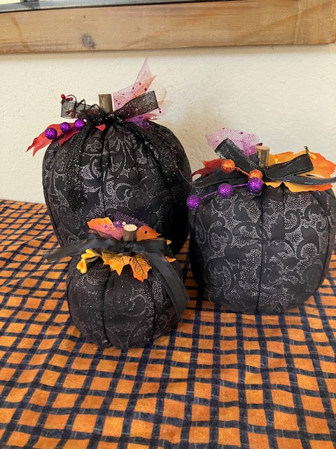 These pumpkin sets are a great addition to your Fall & Halloween decor. They are available for a LIMITED TIME only. I can take a special orders on these sets only. They are handmade with quality fabrics and decorated for the occasion. Put them on your table as a set or put in various places for a special effect at halloween.
